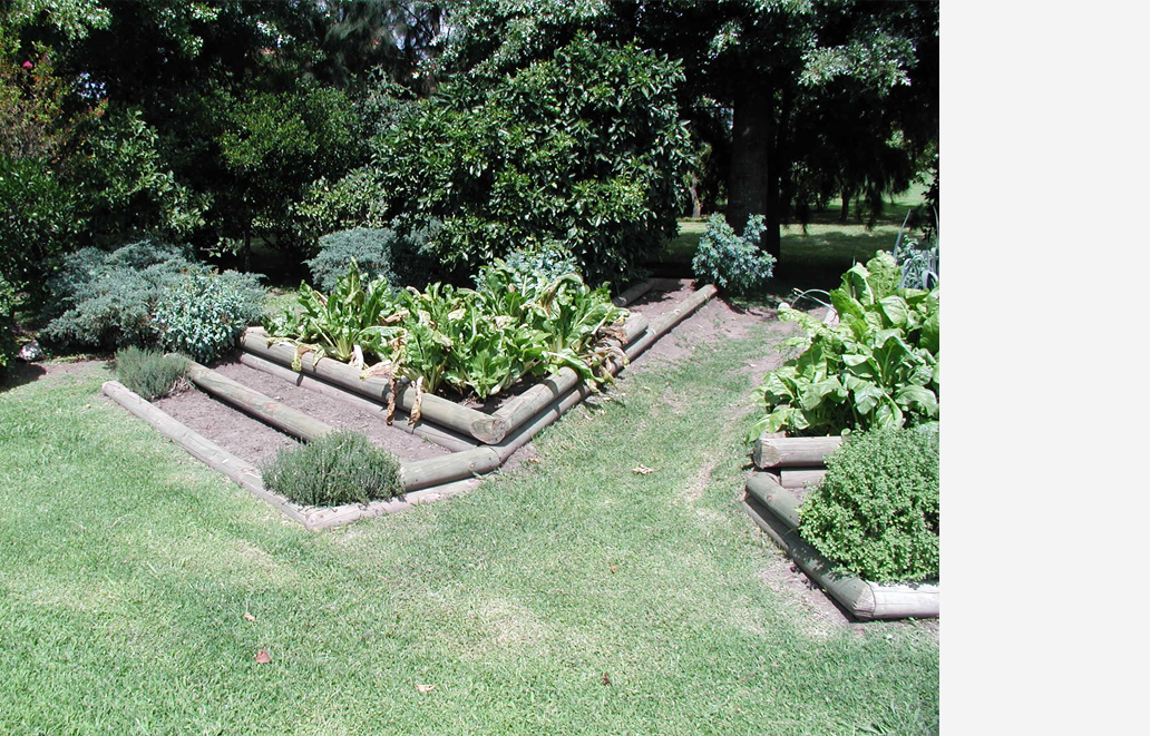 Huerta diseñada con palos redondos de eucalipto escalonada en 3 niveles, uno mas alto que el otro, caminos interiores para acceder a todos los sectores y niveles.