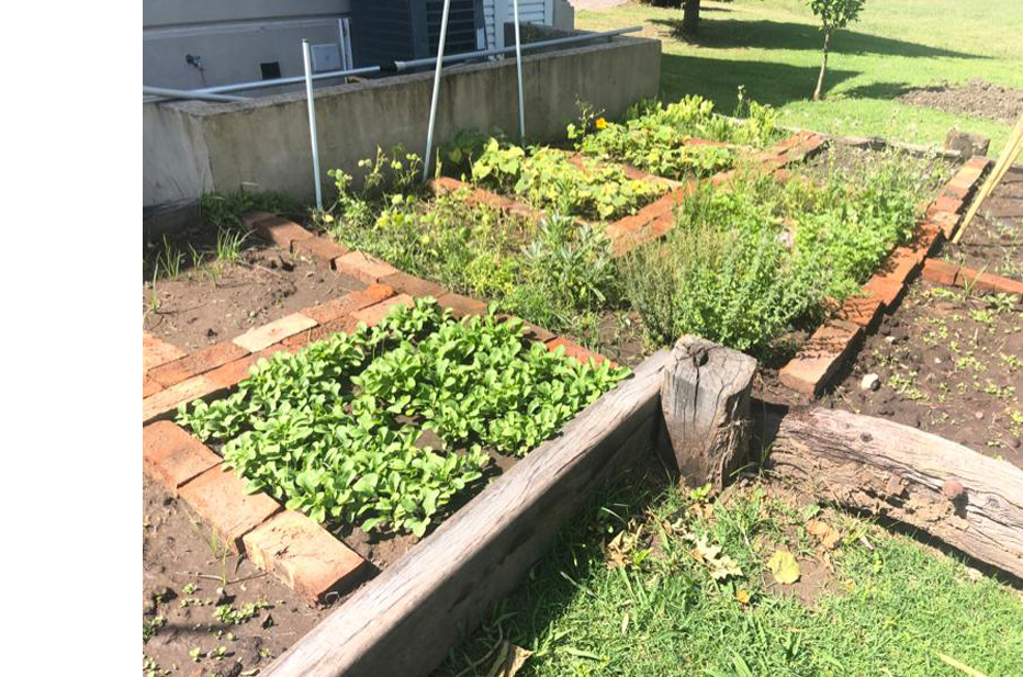 Huerta diseñada con materiales mas rústicos, en este caso con durmientes antiguos de vías de tren y se uso para la división de los almácigos y también para caminar entre ellos y tener acceso a toda la huerta los ladrillos comunes