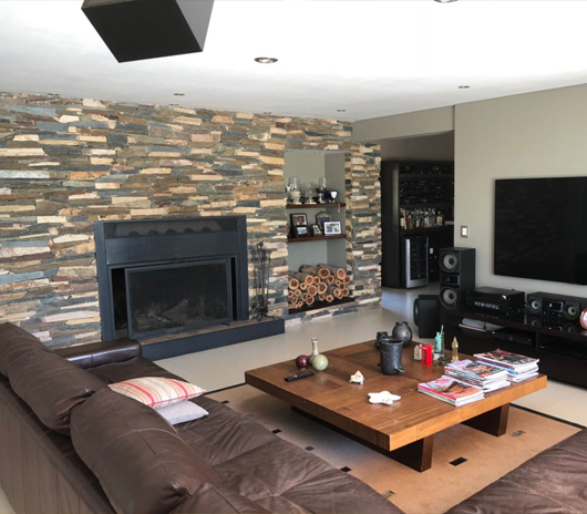 Barra Bar de un quincho interior con parrilla y horno pizzero revestido en acero inoxidable, con cajones de acero inoxidable para el carbon, la vajilla, y los utensilios necesarios. La barra esta pensada para sus respectivas butacas del lado exterior y del lado interior contiene un anafe eléctrico, como asi también debajo de la misma incorpora un frezzer, una heladera y un lavavajillas bajo mesada.
