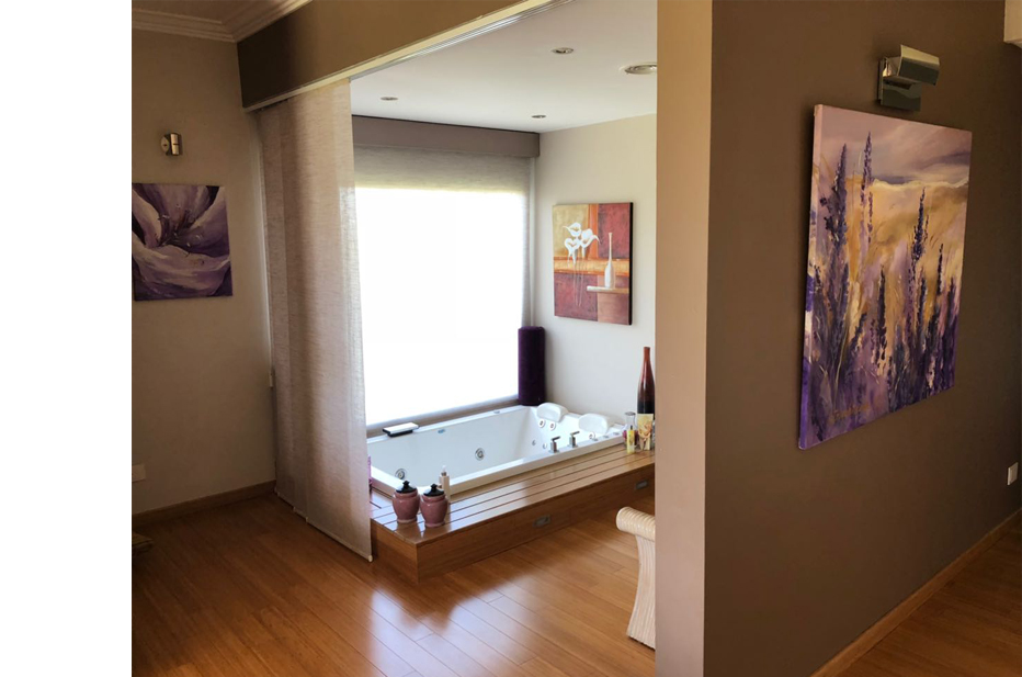 Sector de Jacuzzi doble para el uso simultáneo de 2 personas integrado a la suite principal, el Jacuzzi tiene un cortinado automatizado tipo roller que al levantase da una amplia vista del parque y cancha de golf. Tambien tiene un cortinado automatizado interior que lo separa o lo integra a la suite en caso de querer independizarlo o integrarlo a la misma segun el uso que se le quiera dar