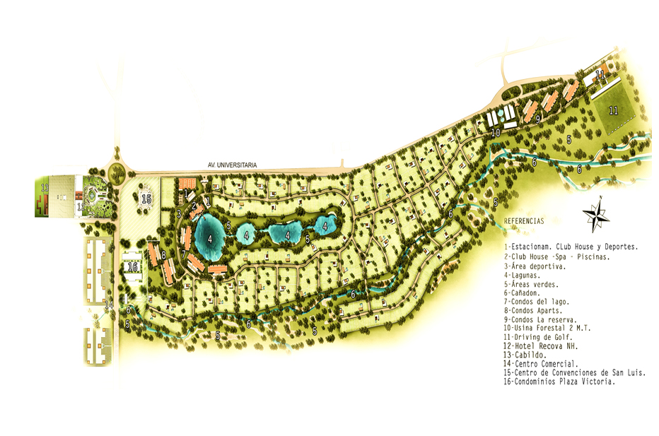 El club de campo esta desarrollado sobre 58 Ha, cuenta con lagunas interconectadas, amenities como canchas de tenis, fútbol, basket, piscina, solárium, Club House, plaza para niños entre otros. El masterplan tiene aproximadamente 480 lotes de 700m2 a 1.000m2. Condominios frente el lago central. Un sector de Barrio Colonial con 132 departamentos. Amplias areas verdes, arroyo con cañadón que lo bordea, que le dan un gran valor paisajistico.